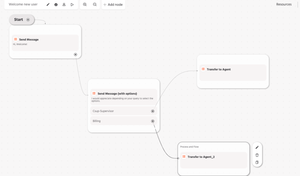 The first step would be to create the flow from where you would like to allow the users to request a live chat.You would need to identify the categories and map the team members as per the category and the channels you want them to handle.As an example I have two Agents, one would be managing Security related questions and the other services related queries, a sample flow below and an Agent map according to it.