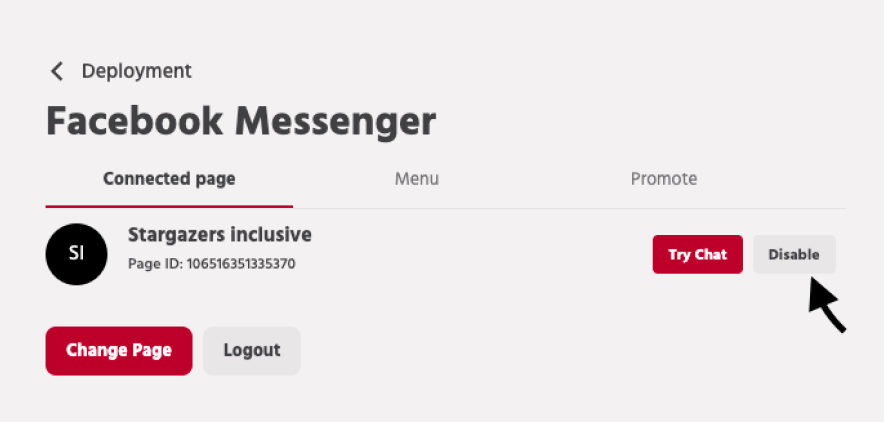 Step 3: Click on the Disable button to disable the bot from the page it was deployed on once done you can log out of the Facebook messenger.