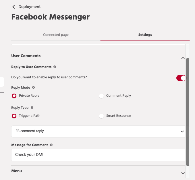 Once you link your Facebook page to your bot you can go to the Settings tab and select User Comments.