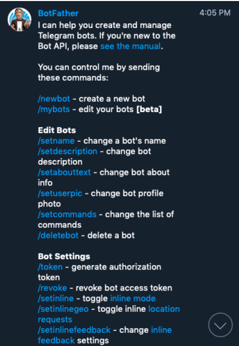 1. You’ll see a list of commands that can be used to help set up your bot.